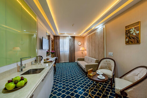 نیمبها اقامت کودک زیر 2 سال (درصورت عدم استفاده از سرویس) رایگان میباشد و بازه سنی برای اقامت کودک بین 2 الی 4 سال (درصورت عدم استفاده از سرویس) نیم بها محاسبه میگردد. لازم به ذکر است : اقامت رایگان و نیم بها تنها برای یک کودک محاسبه میگردد.